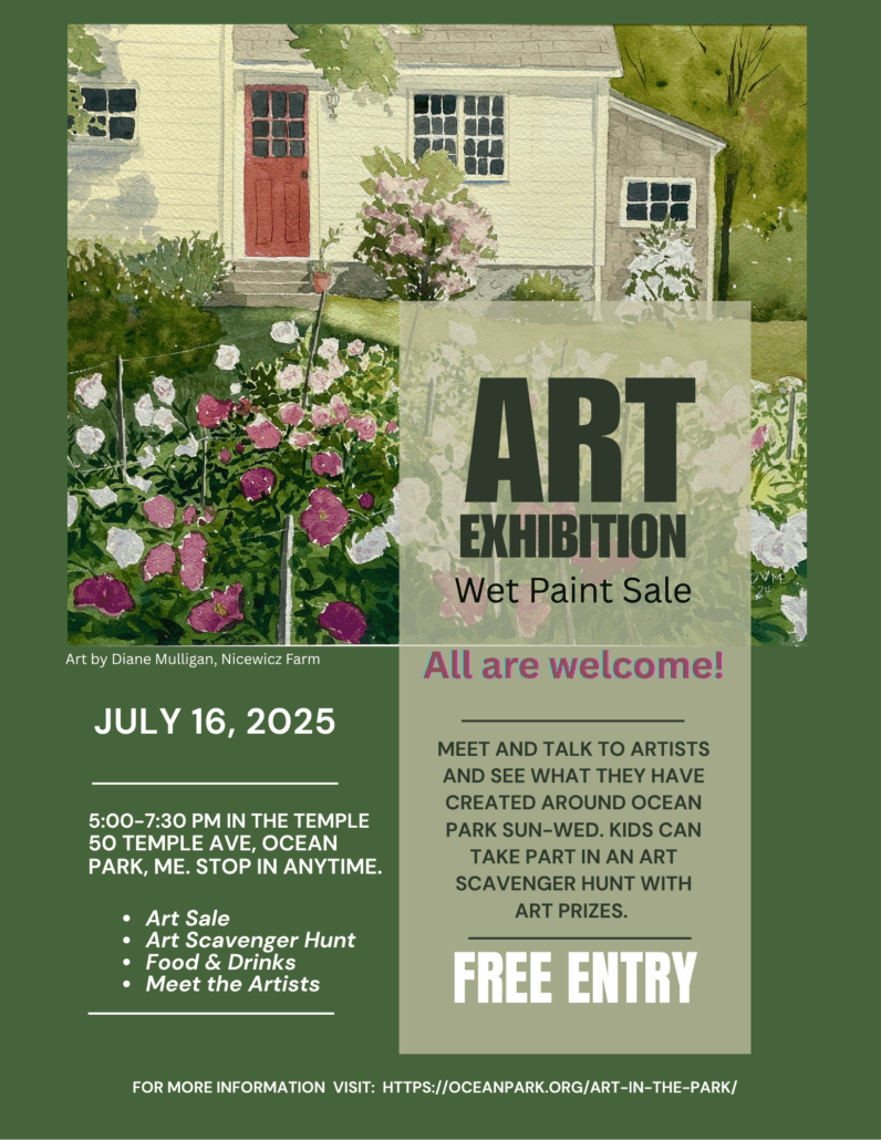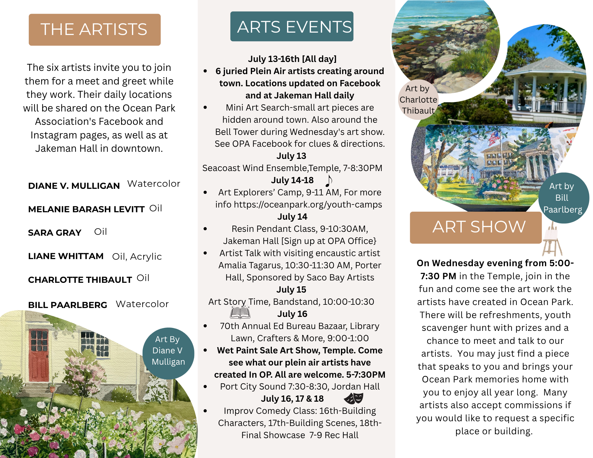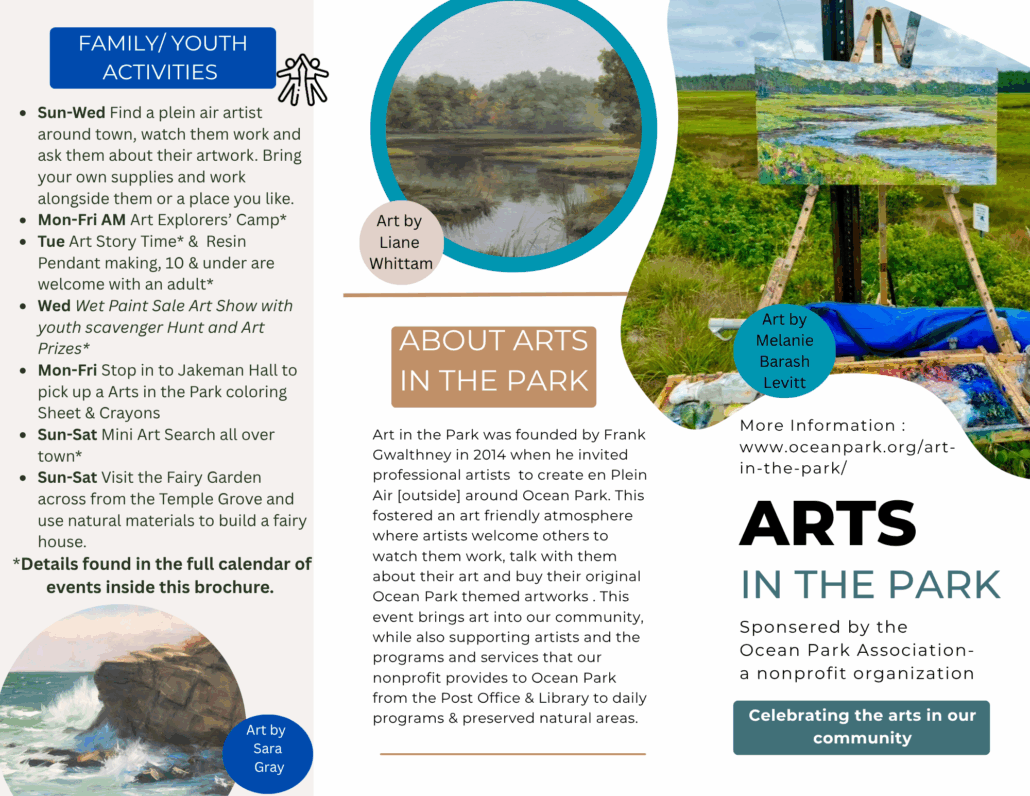 art scavenger hunt for families, art classes for all ages to sign up for, music, poetry, Improv comedy and more. Please follow the Ocean Park Association Facebook page or the sign in front of Jakeman Hall for updates on programs and to see where the artists will be painting each day.