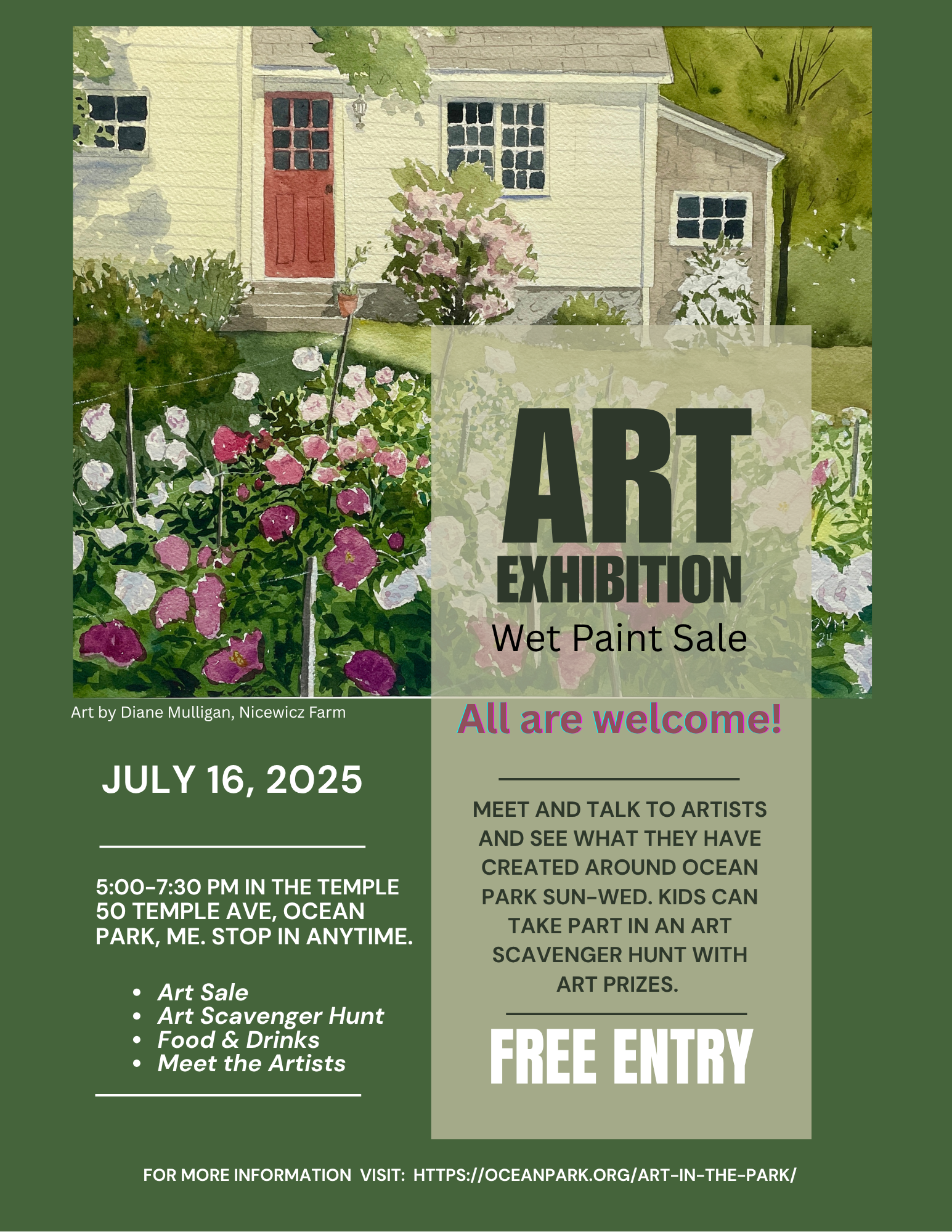 - July 16: 5:00-7:30 PM: Wet Paint Sale Art Sale & Reception at the Temple – Meet the Artists, view the art created this week in Ocean Park and purchase a piece for your family enjoy for generations. Purchases benefit the artist and the OPA.